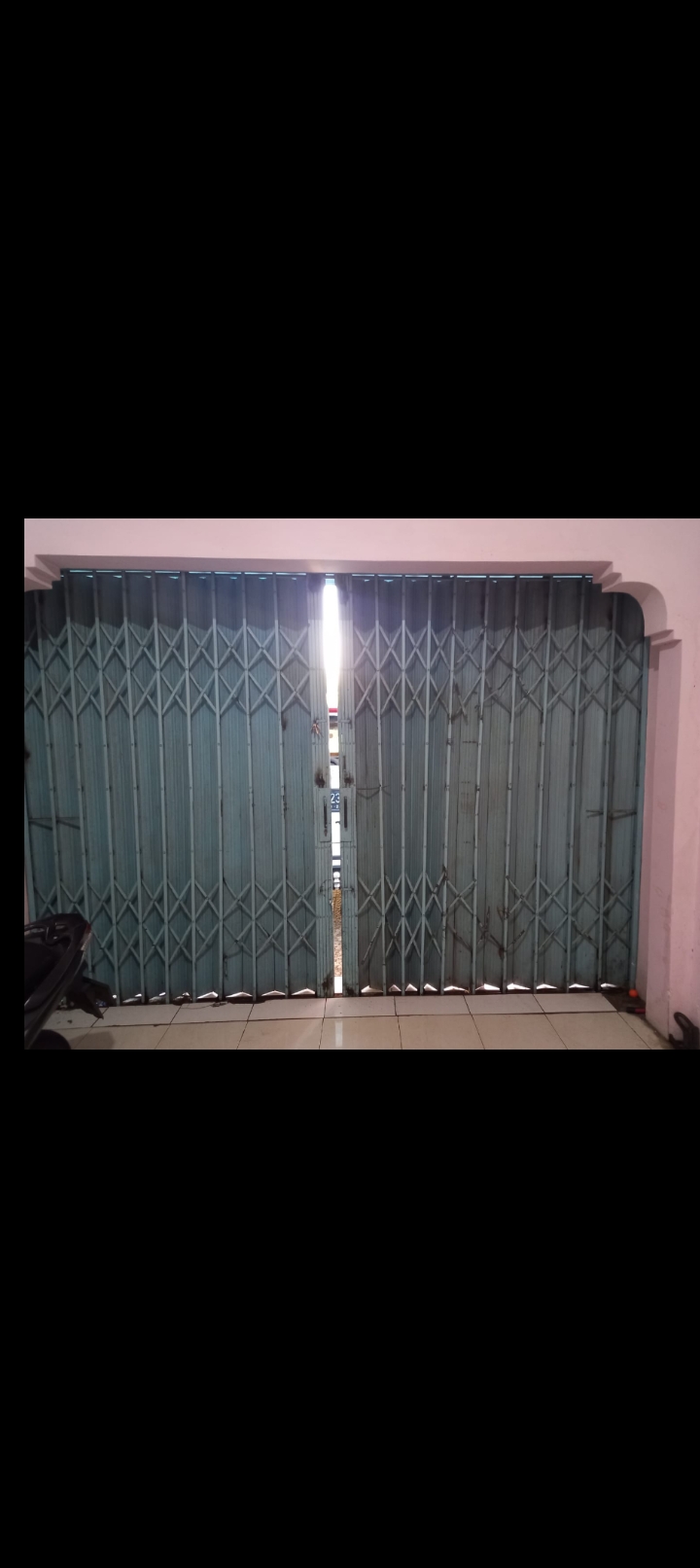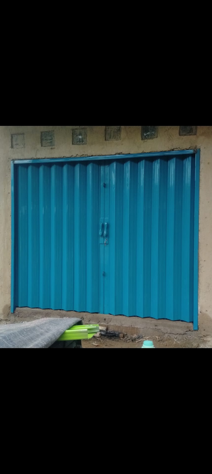 Folding gate (daun pintu, rel atas & bawah, roda, pengunci)